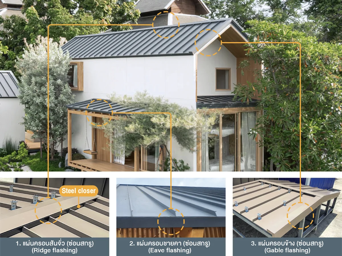 นอกจากนี้ ยังเพิ่มความสวยเนี้ยบของงานหลังคา ด้วยงานครอบแบบพิเศษ – ซ่อนสกรู (Special Flashing Hidden-screw) ในการเก็บรายละเอียดรอยต่อให้เนียนตา เพราะไร้รอยสกรู เพิ่มความสวยเนี้ยบเรียบหรูให้กับบ้านยิ่งกว่าเดิม ได้แก่ แผ่นครอบของสันจั่ว (ดังรูปที่ 1), แผ่นครอบของเชิงชายคา (ดังรูปที่ 2) และแผ่นครอบด้านหน้า (ดังรูปที่ 3) เป็นต้น
