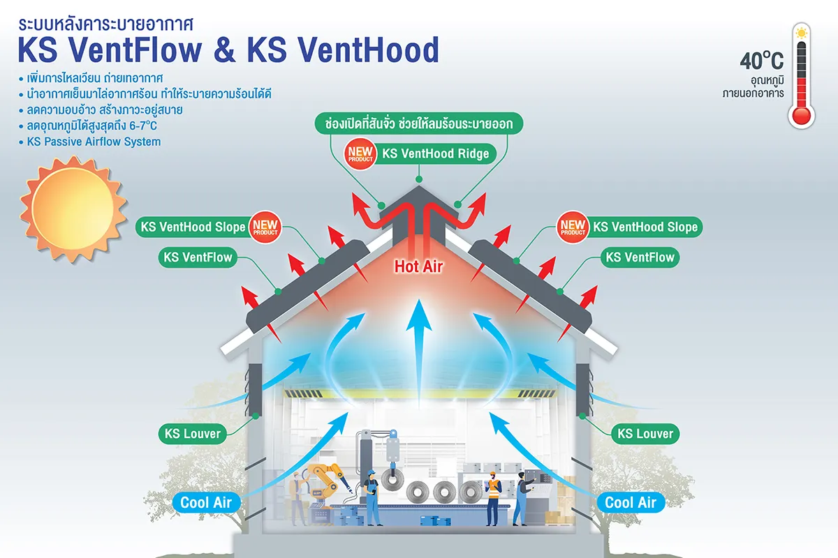 - ติดตั้งระบบหลังคาระบายอากาศ แบบธรรมชาติ (KS Roof Ventilator) เพิ่มการระบายอากาศ เป็นแบบ Passive airflow ventilation ช่วยประหยัดค่าไฟฟ้า